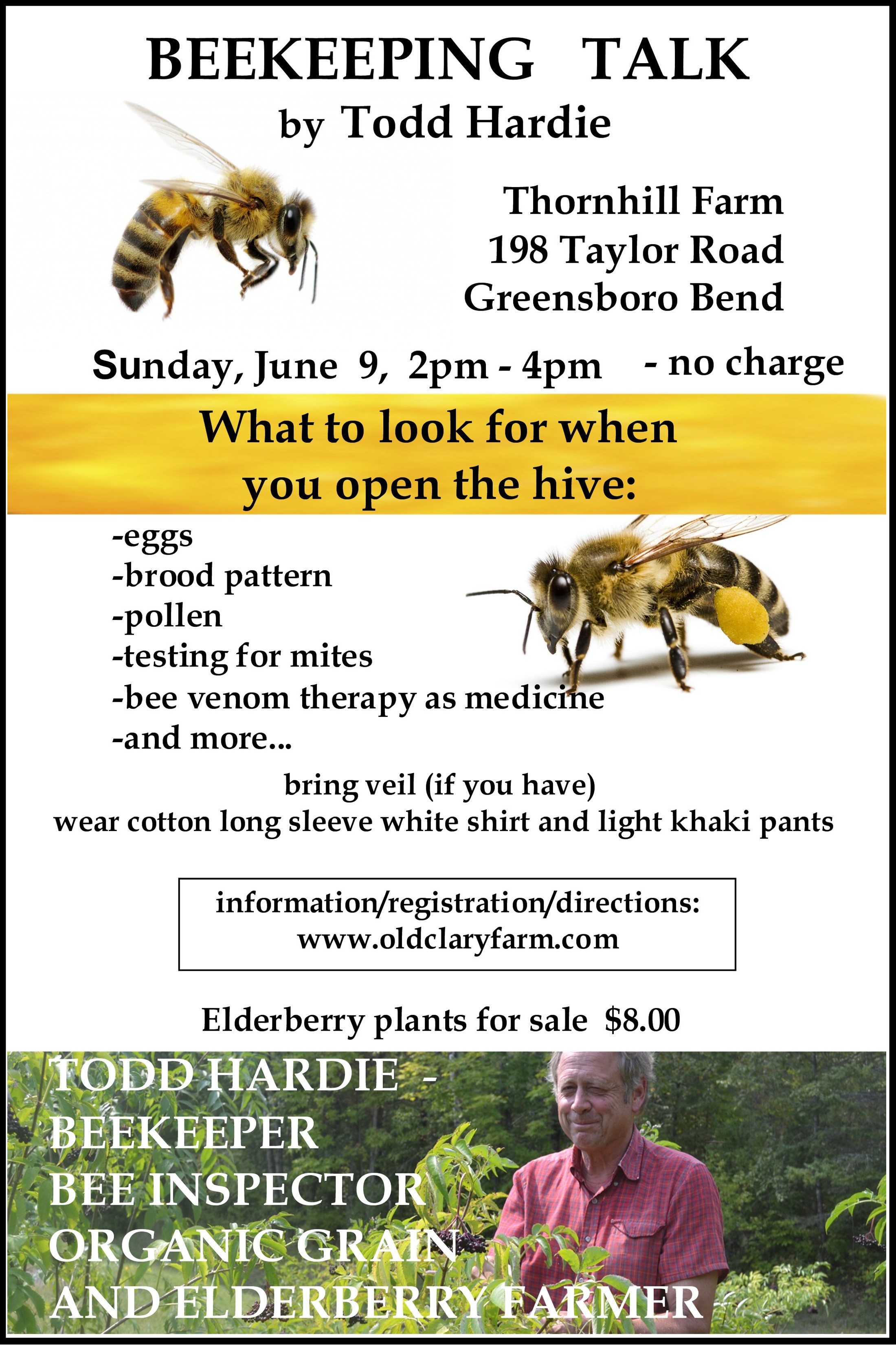 Beekeeping Talk by Todd Hardie What to bring: If you have, bring a veil. Also, wear a white cotton long sleeve shirt and khaki pants (bees don't like synthetic materials)