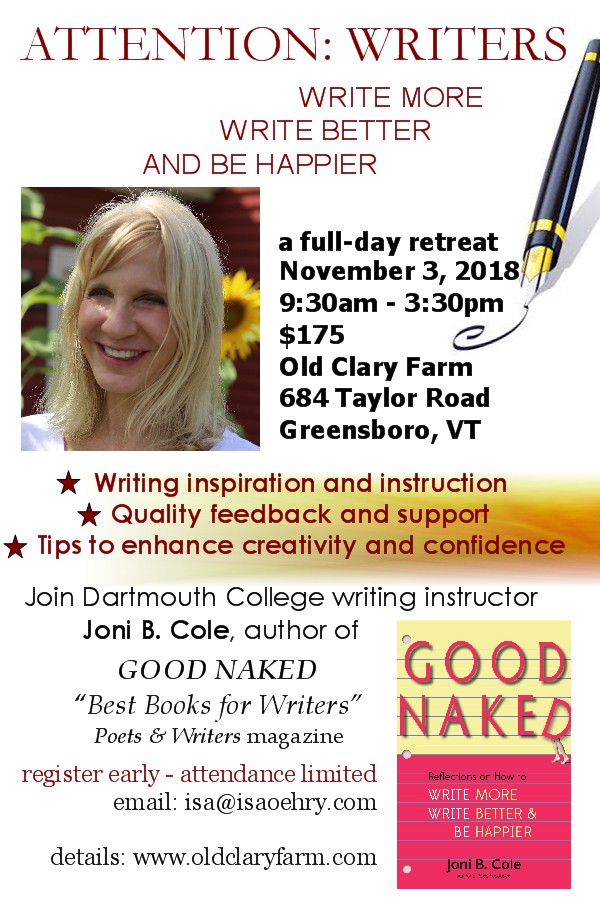 About Joni B. Cole: Author and writing teacher Joni B. Cole has spent much of her career helping people write more, write better, and enjoy a more productive and positive creative process. She believes there is a writer in anyone who chooses to follow that path, and that writing and sharing our stories is not only personally meaningful, but one of the most powerful forms of social activism. Joni's new book Good Naked: Reflections on How to Write More, Write Better, and Be Happier is included in Poets & Writers magazine's list of “Best Books for Writers, and she is the author of the acclaimed book Toxic Feedback: Helping Writers Survive and Thrive (“I can't imagine a better guide to [writing's] rewards and perils than this fine book,” American Book Review ). Joni is also the author of Another Bad-Dog Book: Essays on Life, Love, and Neurotic Human Behavior , and the three-volume “This Day” series which invited hundreds of women across America and from all walks of life to share the reality of their daily lives. She teaches in the Master of Arts in Liberal Studies program at Dartmouth College, serves on the creative writing faculty of the New Hampshire Institute of Art, and is founder of the Writer's Center of White River Junction, Vermont. Joni is also a frequent contributor to The Writer magazine, and leads expressive writing workshops for a diversity of social service programs. Joni has been nominated for a Pushcart Prize and USA Fellowship Award. For more information: www.jonibcole.com |