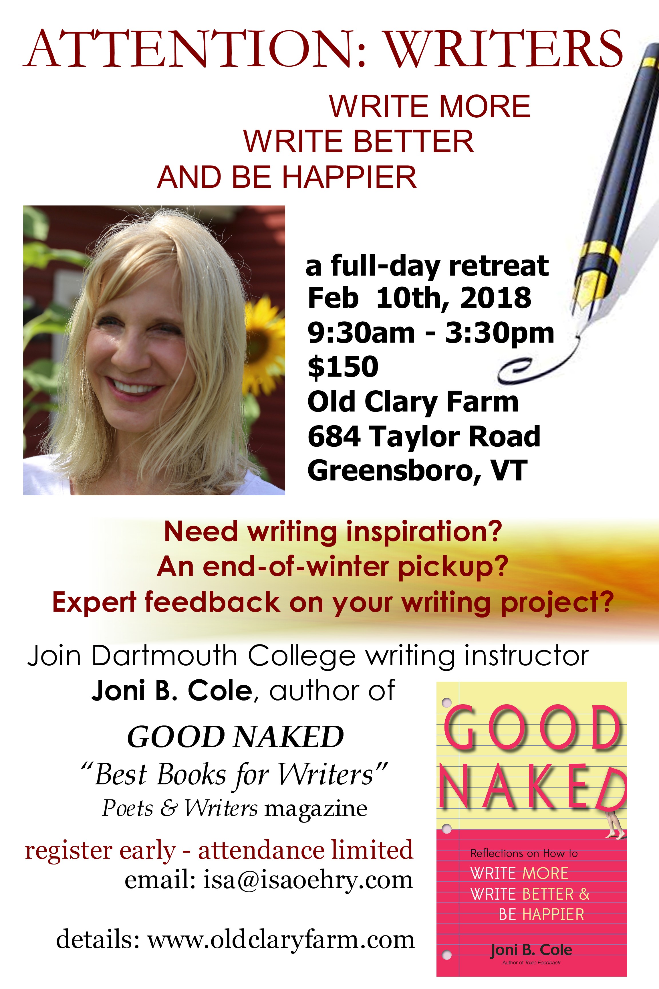 About Joni B. Cole: Author and writing teacher Joni B. Cole has spent much of her career helping people write more, write better, and enjoy a more productive and positive creative process. She believes there is a writer in anyone who chooses to follow that path, and that writing and sharing our stories is not only personally meaningful, but one of the most powerful forms of social activism. Joni's new book Good Naked: Reflections on How to Write More, Write Better, and Be Happier is included in Poets & Writers magazine's list of “Best Books for Writers, and she is the author of the acclaimed book Toxic Feedback: Helping Writers Survive and Thrive (“I can't imagine a better guide to [writing's] rewards and perils than this fine book,” American Book Review ). Joni is also the author of Another Bad-Dog Book: Essays on Life, Love, and Neurotic Human Behavior , and the three-volume “This Day” series which invited hundreds of women across America and from all walks of life to share the reality of their daily lives. She teaches in the Master of Arts in Liberal Studies program at Dartmouth College, serves on the creative writing faculty of the New Hampshire Institute of Art, and is founder of the Writer's Center of White River Junction, Vermont. Joni is also a frequent contributor to The Writer magazine, and leads expressive writing workshops for a diversity of social service programs. Joni has been nominated for a Pushcart Prize and USA Fellowship Award. For more information: www.jonibcole.com |