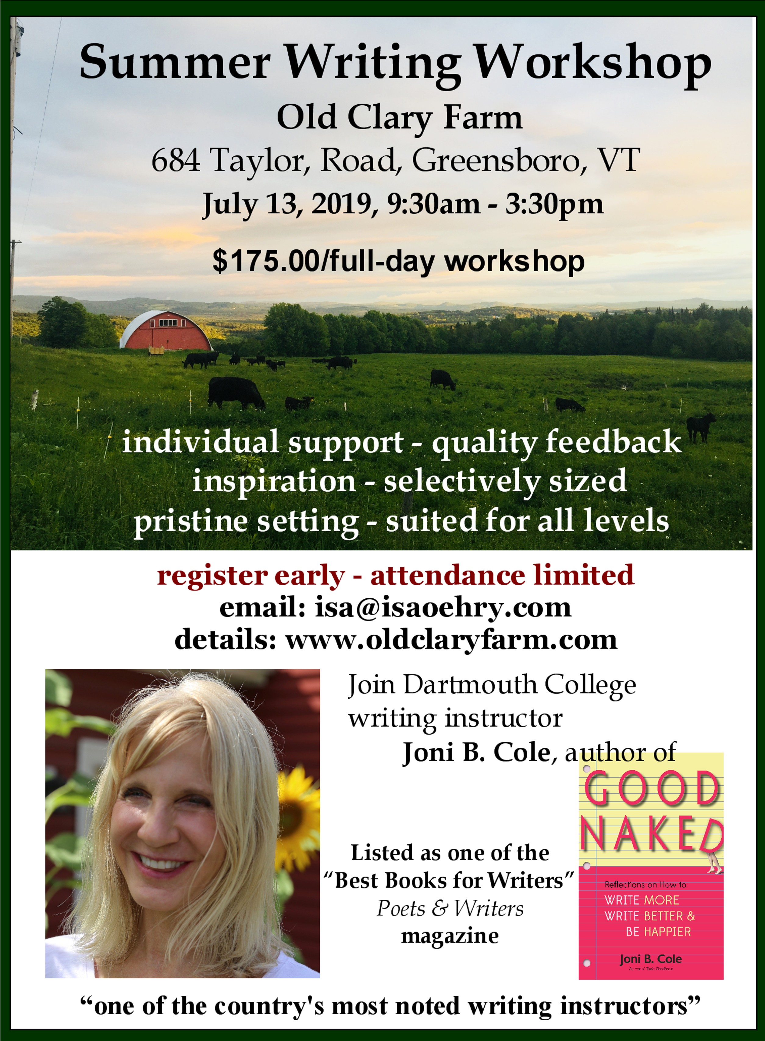 Reading Good Naked by Joni B. Cole prior to the workshop is highly recommended. It is not only fun and entertaining but also a great primer for the workshop. The book can be ordered at: www.jonibcole.com
